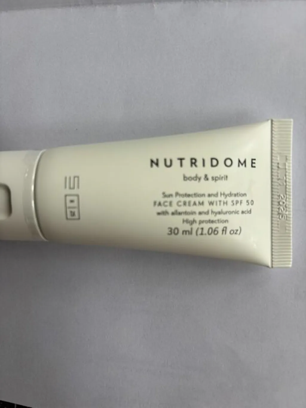 A NUTRIDOME SPF 50 fényvédő krém könnyű textúrájú, jól kenhető és gyorsan felszívódik. A magas szintű védelem mellett a formula hidratálja és táplálja az arcot. A készítményben található hialuronsav megköti a vízmolekulákat és megvédi a bőrt a kiszáradástól. Az allantoin hozzáadása erős hidratálást biztosít, valamint regeneráló és nyugtató hatással van az arcpírra. A tokoferol, vagyis a népszerű E-vitamin antioxidáns hatású, semlegesíti a szabad gyököket és lassítja a bőr öregedési folyamatát.
